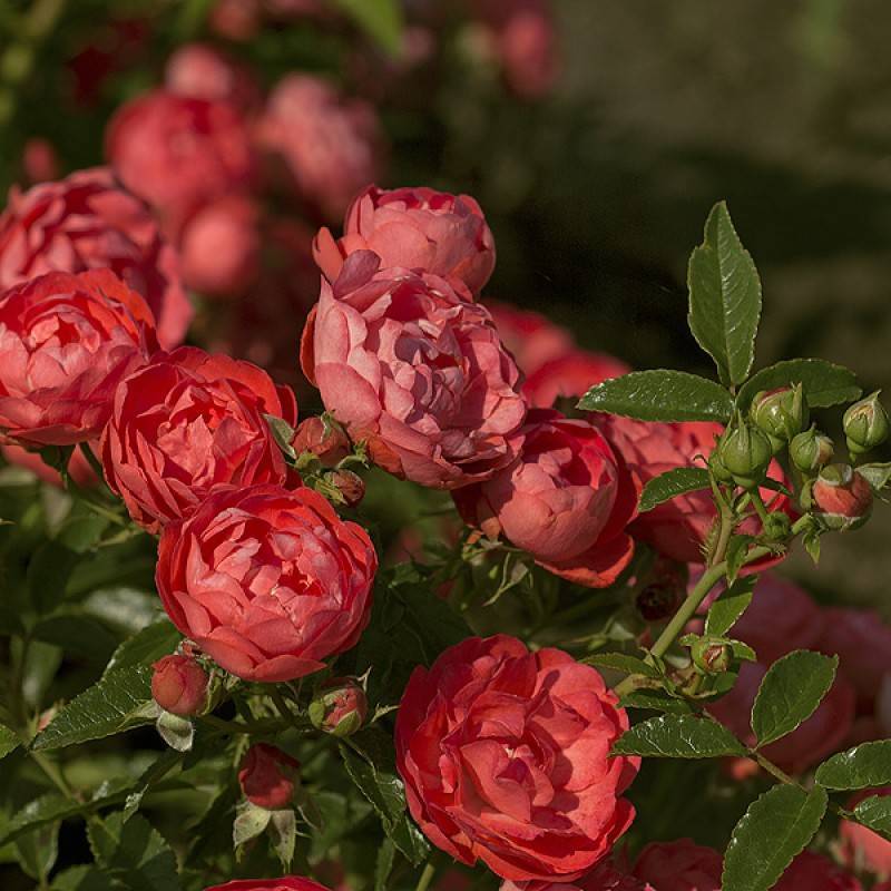 Роза Морсдаг – это компактное растение, высота которого не превышает 40-50 см. Характеризуется куст хорошей раскидистостью ветвей, тонкими, но крепкими побегами, на которых нет шипов, умеренной облиственностью мелкими ярко-зелеными листочками удлиненной формы с выраженным глянцем, а также развитым корневищем. За счет раскидистости ветвей куст приобретает пышную форму, достигая диаметра до 75 см. Внешне куст напоминает почвопокровник. В вегетационный период на каждом цветоносе формируется от 5 до 10 бутонов, собранных в многоцветковые соцветия. Посадка саженцев полиантовых роз соответствует правилам высаживания обычных. С той лишь разницей, что они не такие требовательные к месту посадки и прекрасно растут в полутени. Это даже лучше, чем солнцепек. Им не страшна избыточная влажность, но это не значит, что их надо специально высаживать в подтапливаемых местах, с высоким залеганием грунтовых вод.